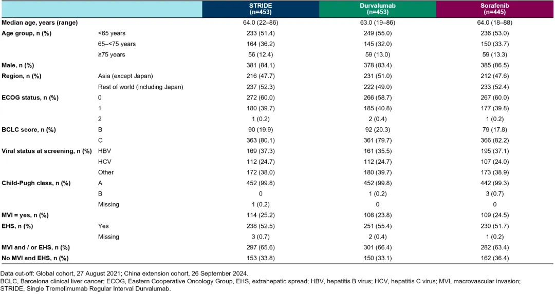 在中国扩展队列及全球队列中,各治疗组基线特征总体保持平衡。36.6%的受试者存在基线HBV感染,其中STRIDE方案组、度伐利尤单抗组和索拉非尼组分别占37.3%、35.5%和37.1%。中国扩展队列的基线HBV感染率为75.0%。