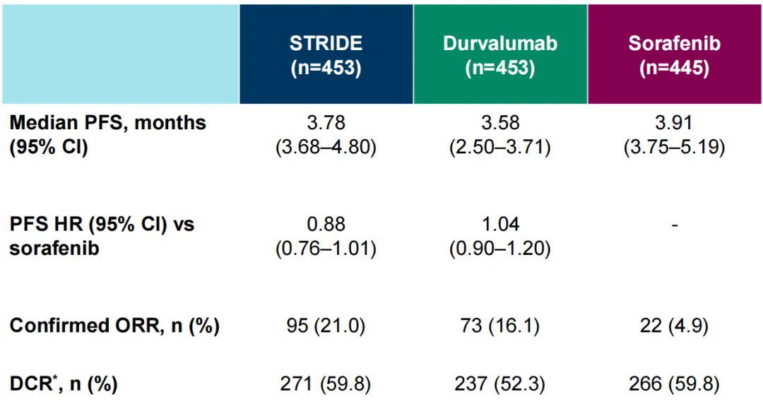 在中国扩展队列和全球队列的汇总分析中,STRIDE方案组、度伐利尤单抗组及索拉非尼组的中位PFS分别为3.78个月、3.58个月与3.91个月。STRIDE方案组(21.0%)与度伐利尤单抗组(16.1%)的ORR均高于索拉非尼组(4.9%)。