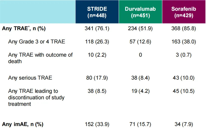 STRIDE方案组与度伐利尤单抗组的任意治疗相关不良事件(TRAE)发生率均低于索拉非尼组(76.1%、51.9%、85.8%),3级或4级TRAE发生率同样低于索拉非尼组(26.3%、12.6%、38.0%)。全球队列的主要分析后未再报告STRIDE方案组的其他严重TRAE,安全性可控可管理。