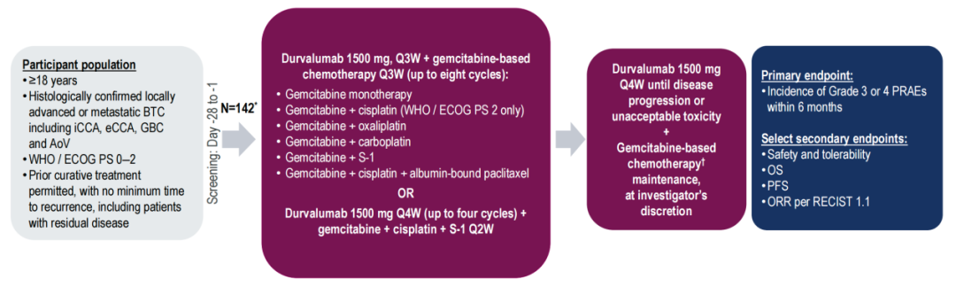 TOURMALINE研究(NCT05771480)是一项正在进行的全球、单臂、开放标签的IIIb期研究,评估了度伐利尤单抗联合基于吉西他滨的化疗方案作为晚期BTC一线治疗的安全性与有效性。本次ESMO Asia大会重点报告了来自亚洲患者的早期分析结果。研究纳入了包括TOPAZ-1研究中排除在外的患者,如ECOG PS评分为2分、壶腹癌以及术后或辅助治疗后6个月内复发的患者。纳入患者接受度伐利尤单抗(1500mg)以及研究者选择的G-based化疗方案(度伐利尤单抗+吉西他滨单独使用,或与顺铂[仅ECOG PS评分为2分患者使用]、卡铂、奥沙利铂、替吉奥[S-1]、顺铂+白蛋白结合型紫杉醇联合使用)。给药方面,度伐利尤单抗首次输注时间为60分钟,从第2周期起输注时间缩短至30分钟。