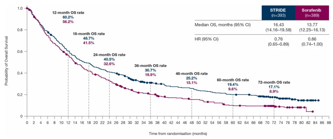 HIMALAYA研究全球队列6年随访数据显示,STRIDE方案组的6年OS率达17.1%,约为索拉非尼对照组的2倍,这也是uHCC一线治疗目前公布的首个6年OS数据。