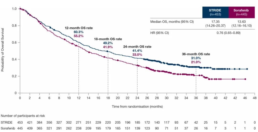 中国扩展队列和全球队列的汇总分析显示,与索拉非尼相比,STRIDE方案在OS方面展现出具有临床意义的改善,中位OS分别为17.35个月和13.63个月(HR=0.76;95%CI,0.65-0.89),12个月、18个月、24个月和36个月的OS率分别为60.3% vs 55.2%、49.2% vs 41.9%、41.4% vs 33.0%、31.0% vs 21.0%。该结果与全球队列主要分析结果一致。