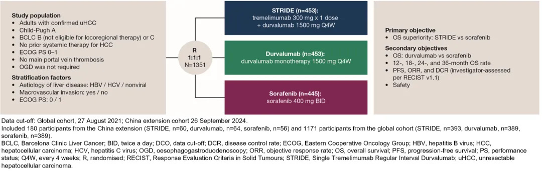 中国扩展队列及全球队列的汇总分析中,主要研究终点为STRIDE组对比索拉非尼组的OS,次要终点包括度伐利尤单抗组对比索拉非尼组的OS,12个月、18个月、24个月和36个月的OS率,研究者根据RECIST v1.1标准评估的无进展生存期(PFS)、客观缓解率(ORR)和疾病控制率(DCR)以及安全性。同时在全球队列中评估了6年随访时的OS和严重不良事件(SAEs)。