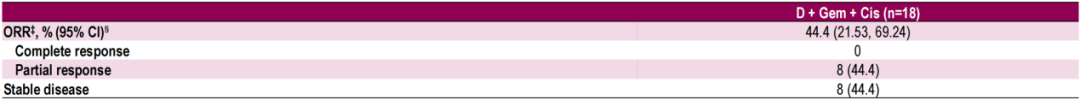 疗效数据显示,在亚洲患者中,整体ORR达26.7%。其中,ECOG PS 2分的患者接受度伐利尤单抗联合GemCis方案治疗,ORR达到了50.0%,与全球治疗人群中的ORR相当(44.4%),展现了令人鼓舞的疗效获益数据(表5)。