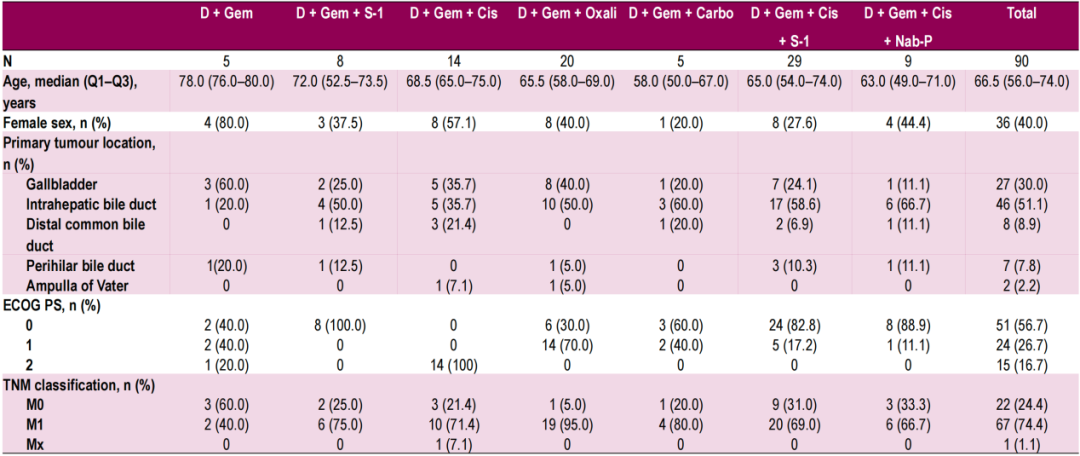 本次研究的亚洲患者中位年龄为66.5岁,其中女性患者占40.0%(36/90)。从肿瘤原发部位看,肝内胆管癌最为常见,占51.1%(46/90)。疾病分期方面,高达74.4%(67/90)的患者在入组时已发生远处转移(M1)。ECOG PS 2分患者占16.7%(15/90)。值得注意的是,所有ECOG PS 2分的患者均被分配至度伐利尤单抗+吉西他滨+顺铂(D+Gem+Cis)治疗组(表1)。