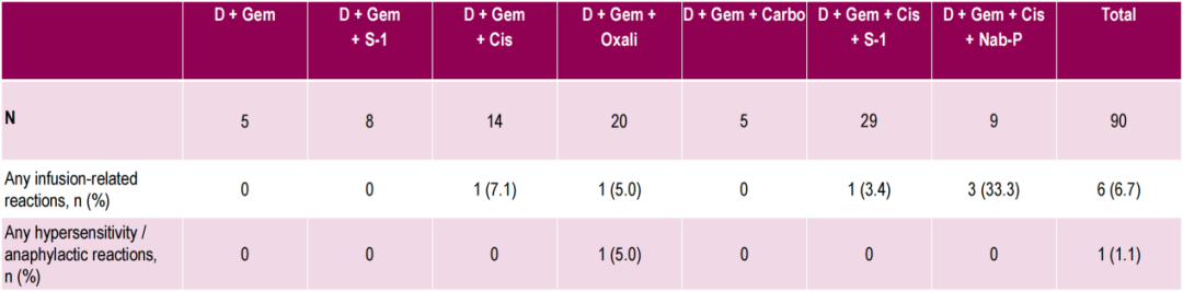 第一周期度伐利尤单抗输注时间为60分钟。从第二周期开始,度伐利尤单抗输注时间减为30分钟。结果显示,输注相关反应发生率为6.7%,过敏/超敏反应发生率为1.1%(表4)。