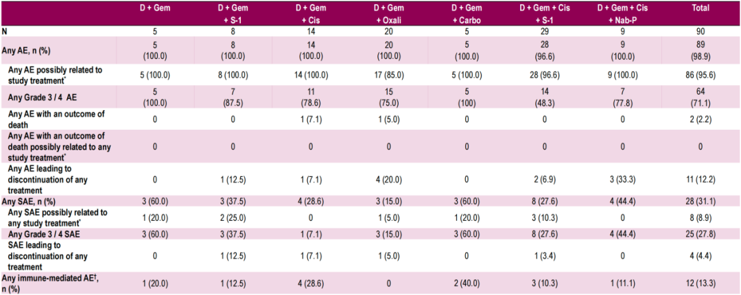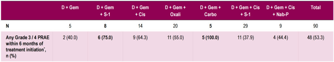 安全性数据显示,亚洲患者中≥3级可能与研究相关的PRAEs发生率为53.3%(95%CI,42.51–63.93)(表2),整体与TOPAZ-1全球数据趋势一致。31.1%的患者经历了严重AE(SAE),AE导致的死亡出现2例,经研究者评估均与研究治疗无关。各组出现导致治疗中断的AE发生率为12.2%,免疫介导的AE发生率为13.3%(表3)。常见不良反应包括中性粒细胞计数降低、贫血、血小板计数降低和胆管炎等。