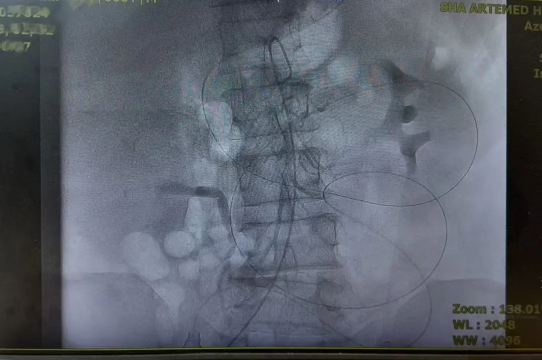 住院后,医生针对患者肿瘤负荷大、合并小肠梗阻的情况,给患者经动脉灌注化疗。2026年1月14日,接受腹腔干动脉、肠系膜上下动脉造影置管,局部灌注奥沙利铂和氟尿嘧啶等药物,目的是直接作用于肿瘤、缓解梗阻。